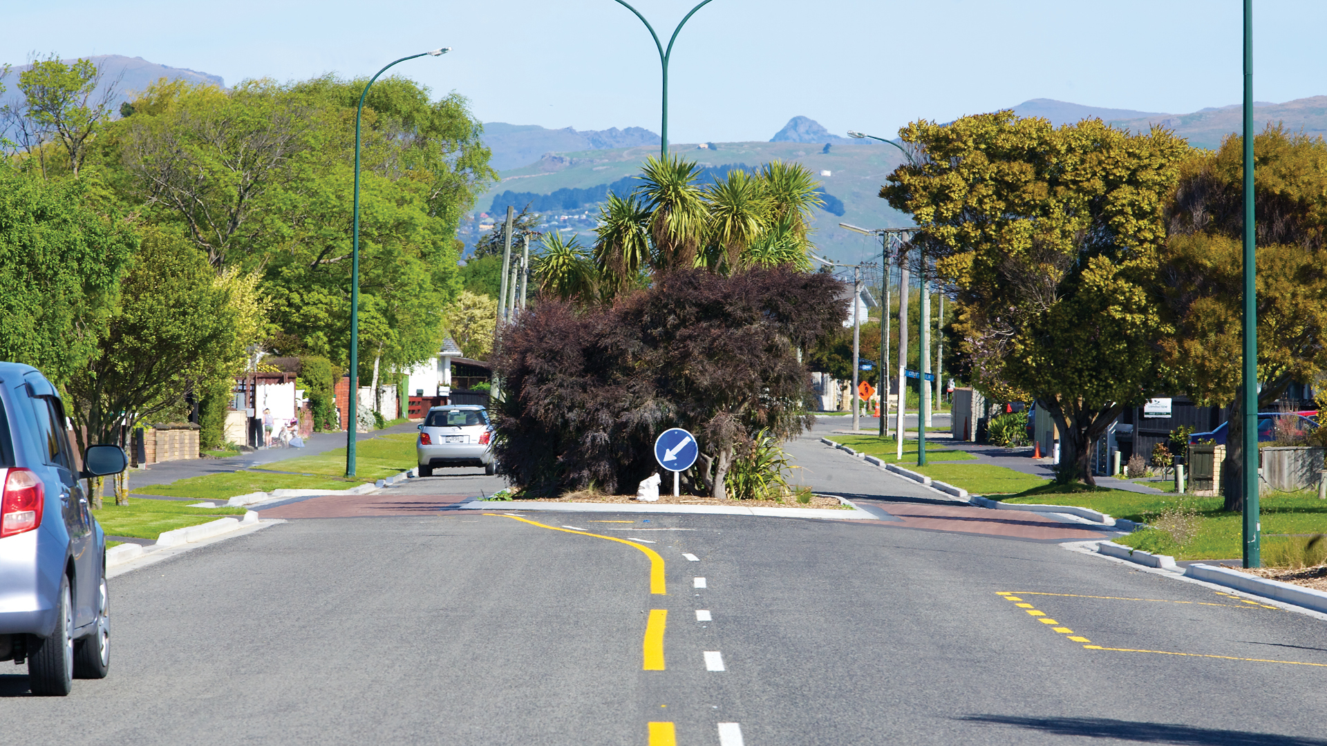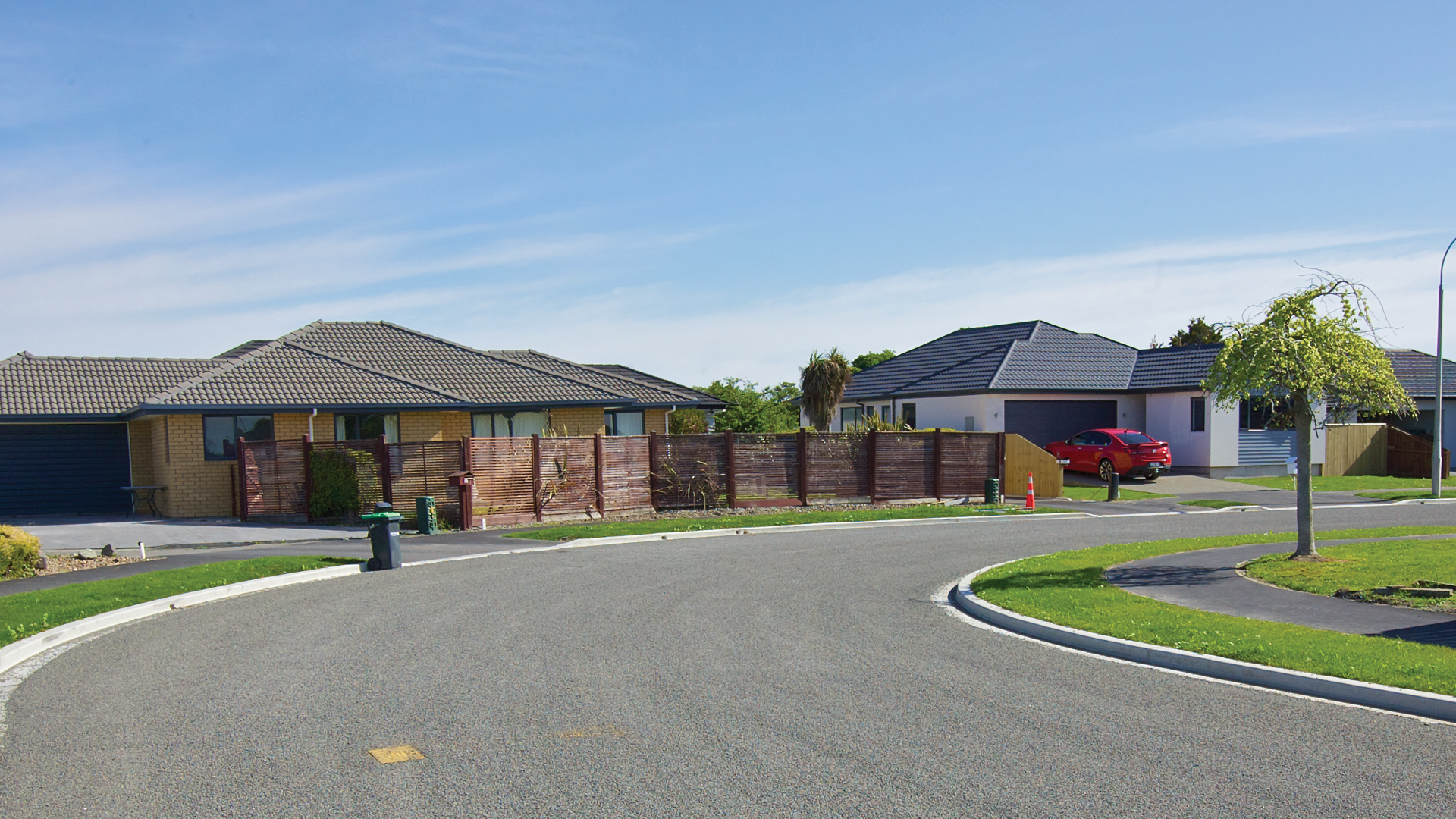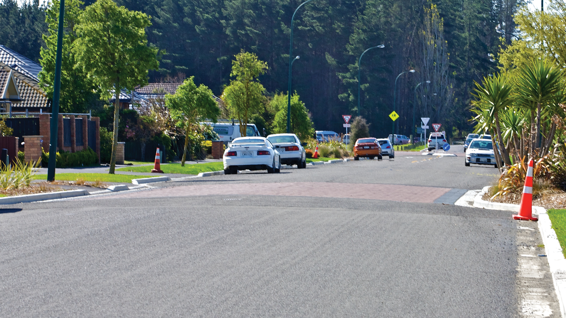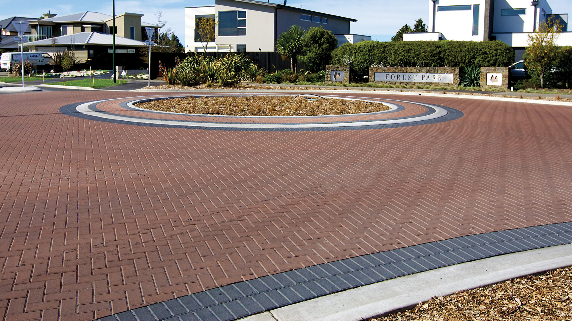 Street furniture, signage, road markings, tree pits, and landscaping delivered alongside scheduled private property works.